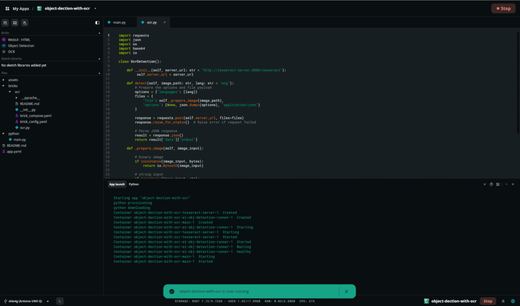 During Arduino Days, our colleague Davide demonstrated Custom Bricks by building an OCR (Optical Character Recognition) Brick from scratch, live on stage. He took an object detection example, created a custom Brick, added a Docker container running Tesseract OCR, wrote the Python interface, and had working text recognition in a matter of minutes.