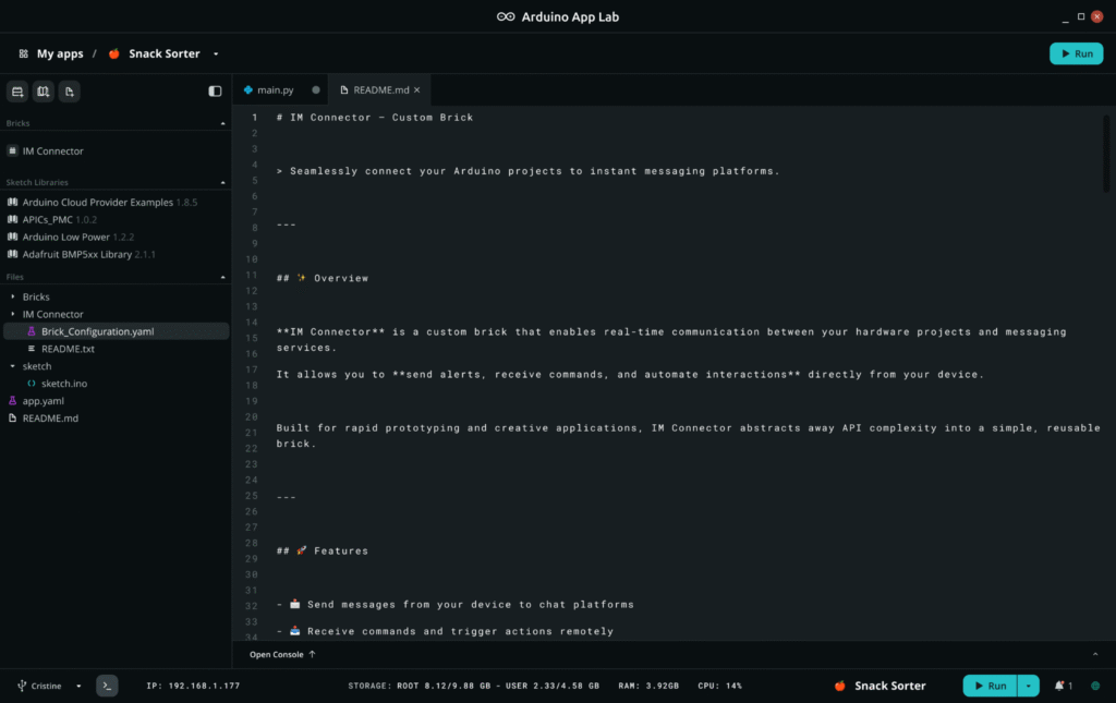 In this release, in addition to Custom Bricks, we’ve made Arduino App Lab smoother and more intuitive across the board: