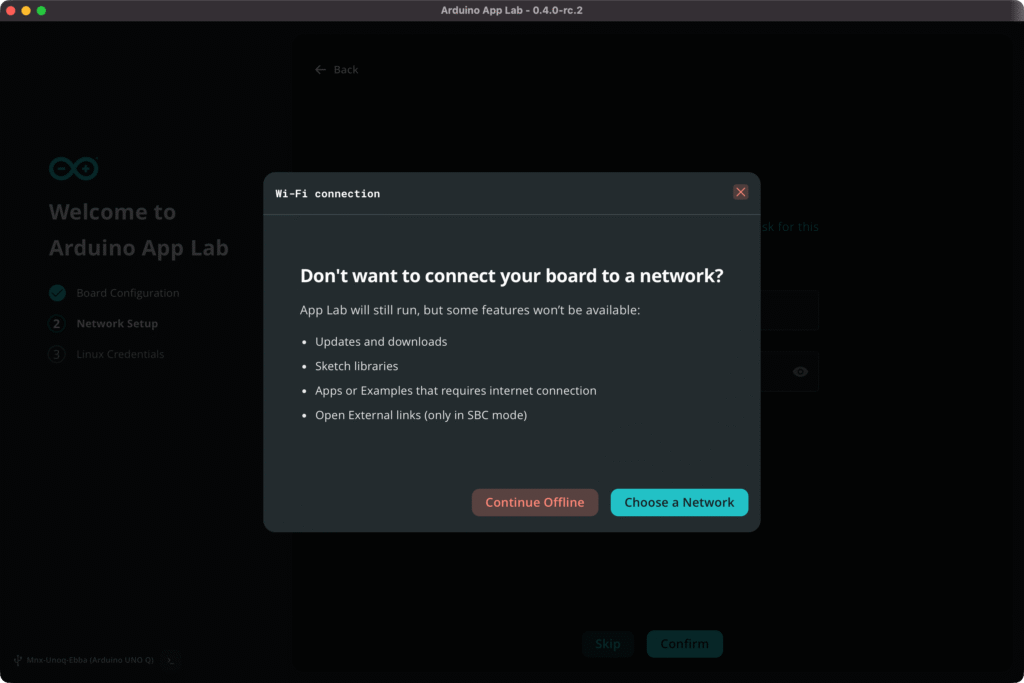 For users working offline or in low-bandwidth situations, Arduino App Lab now allows you to skip connecting your board to the internet at the click of a button, with a dedicated explanation of what features require the board to have an internet connection.