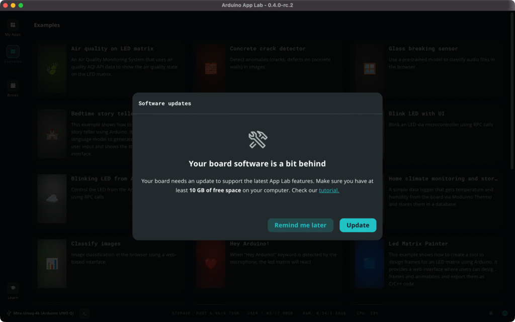 Keeping your UNO Q operating system image up to date is now simpler than ever. Arduino App Lab automatically detects if your UNO Q has an outdated image and guides you through updating directly inside the app, no need for CLI tools or terminal commands.